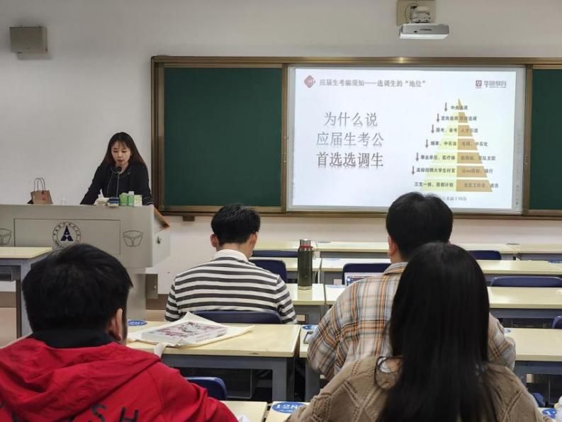 (通讯员 王毅 学生通讯员 钱志玲)为助力研究生精准把握考公选调备考方向,掌握高效备考方法,10月13日晚,学院研究生会综合部在文澴楼217教室成功举办“职引未来”考公选调备考专题讲座。本次活动特邀华图教育机构张余老师担任主讲,围绕考试政策、备考策略及实战技巧展开系统讲解,吸引了学院众多研究生积极参与。