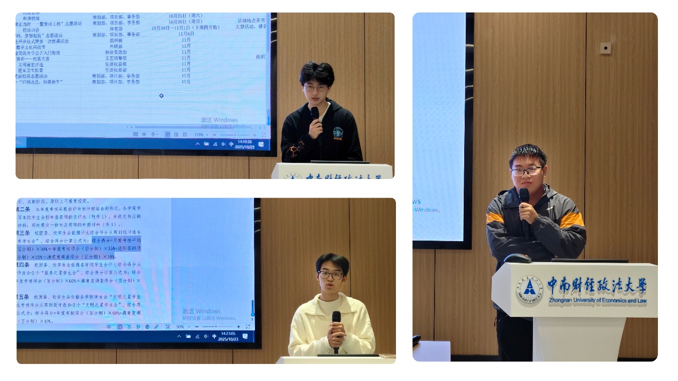 学院团委副书记冯宸祎梳理10-11月团学志整体工作脉络,保障事务有序推进;学生会主席团成员郭峰岑拆解“优秀学生会”评选指标,细化各部门在材料申报、事迹宣传等环节的分工,为评优落地明确路径;体育部主要负责人刘中石介绍10月30日-11月1日校运动会安排,从人员调度、项目对接、赛事报道等方面明确分工,确保活动高效运转。
