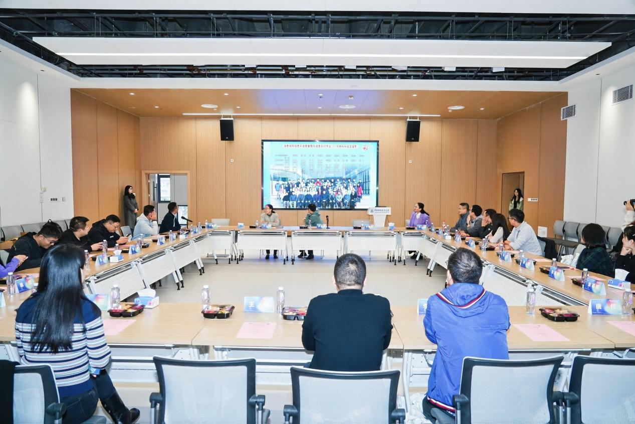 校友们在班长史永的主持下纷纷落座,一场以“廿念不忘 青春从未散场”为主题的信管01级校友毕业二十周年返校座谈会正式启幕。原信管01级年级主任王建荣,原信管0103班主任刘琪,信息工程学院院长金大卫、党委书记王芹、信息系主任刘雅琦等出席座谈会并对各位校友的归来致以最热烈的欢迎。