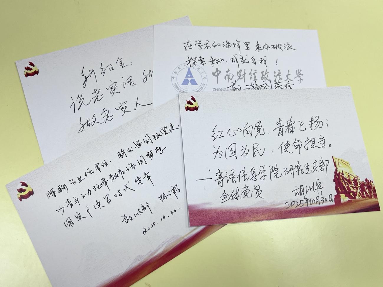胡江滨书记以《在党的旗帜下成长》为题为研究生讲授专题党课,他从中南财经政法大学的红色校史出发,讲述了自己成长、入党以及在校工作的历程。围绕党的二十届四中全会精神,胡江滨书记还重点解读了“十五五”规划的时代意义及推进国家统一的重大部署。四位老党员同志分别在寄语卡上写下对青年党员的殷切期望,鼓励同学们接好历史接力棒,为实现中华民族伟大复兴贡献青春力量。