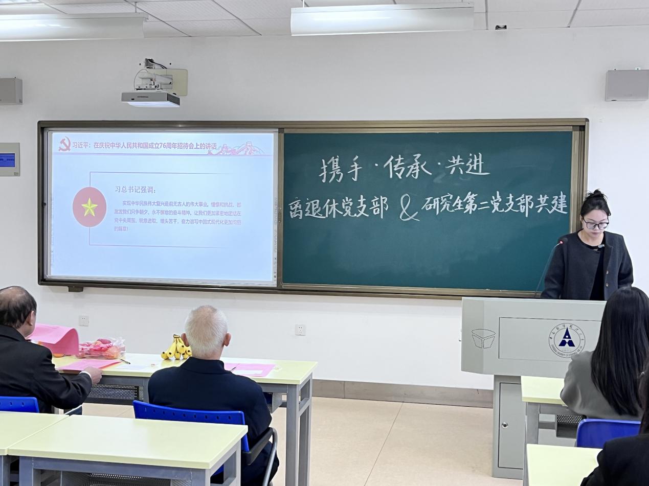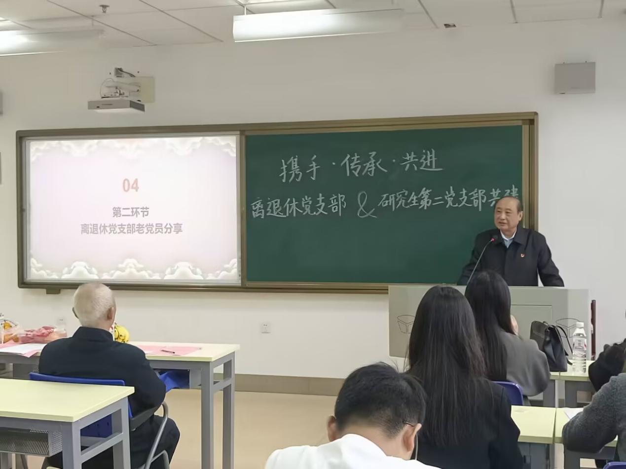 10月30日上午9:30,我院研究生第二党支部联合离退休人员党委在文澴楼539教室开展了离退休党支部共建暨十月主题党日活动。离退休党委副书记胡江滨、首义第二党支部书记路云霞、宣传委员刘燕玲、支部成员刘绍金出席。本次活动以“携手·传承·共进”为主题,搭建“面对面交流、心贴心传承”的互动平台,既让青年党员从老同志奋斗历程中感悟红色初心、汲取精神养分,也让老党员感受组织关怀与青年活力,最终实现“经验传帮带、活力双向赋”的党建新成效,为支部党日活动注入多元动能,强化党性教育实效。