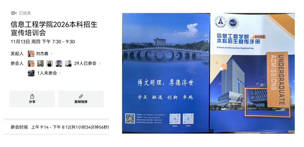 为确保招生宣传工作高效有序开展,学院领导班子高度重视,在院系人员动员、重点高中遴选和宣传资料设计等环节进行了周密部署、精准发力与扎实推进。10月中旬,学院召开全院招生宣传工作专题会议,明确任务分工、宣传重点,并细化各阶段宣传时间节点;10月下旬,学院组织在线培训会,系统解读招生政策与宣讲技巧;11月初,学院精心编印《信息工程学院本科招生宣传折页》,与学校宣传材料形成有效互补,为深入高中开展精准宣讲夯实了基础。