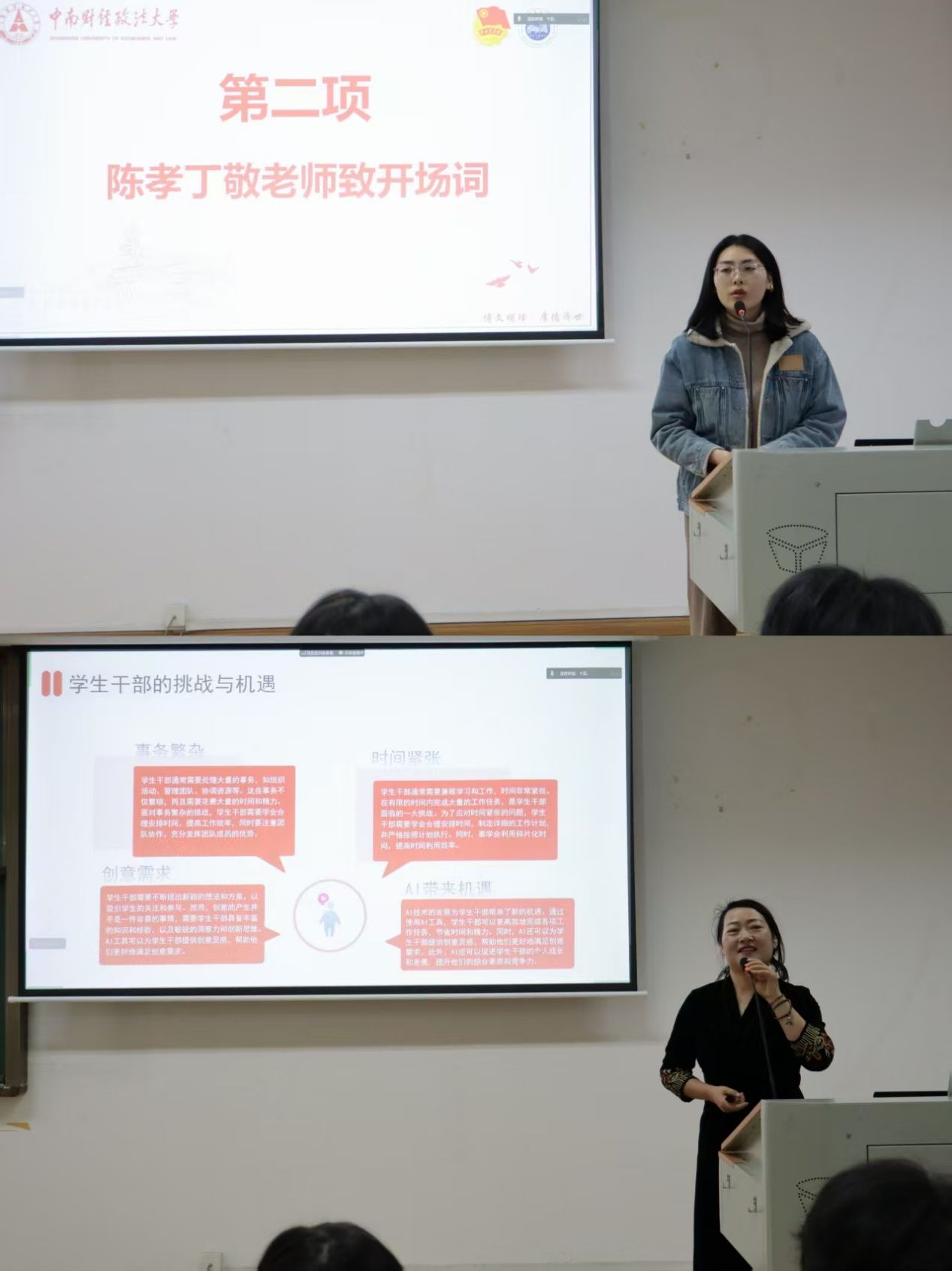 三院联培第三次授课活动于12月7日上午在首义校区文润楼顺利举行。本次培训由信息工程学院团委承办,特邀秋叶集团AI讲师李好老师,围绕“如何用AI助力学生工作提效”展开专题授课。李老师从当前AI技术发展前沿切入,系统梳理了智能写作、数据整理、信息提炼及流程优化等核心办公场景中AI工具的具体应用路径,重点围绕“结构化提示词设计与场景化应用”展开,通过实际案例逐步演示了如何通过精准指令让AI协助完成通知拟写、新闻稿撰写、数据可视化及会议纪要整理等常见任务。