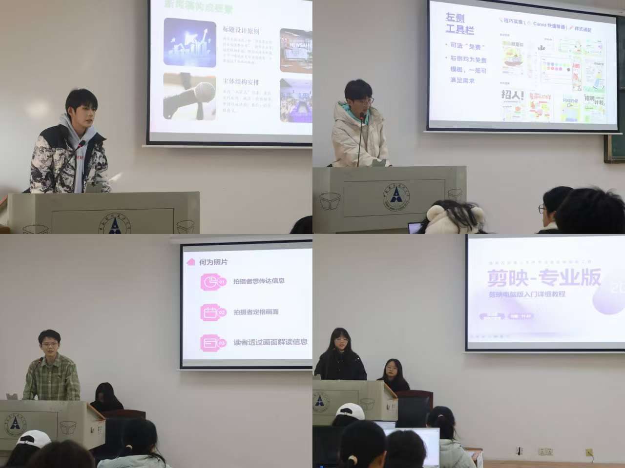 三院联培第二次授课活动于11月22日上午在首义校区文泽楼顺利开展。本次培训由金融学院团委承办,金融学院分团委新闻部、宣传设计部、摄影部及媒体运营部负责人围绕校园新闻报道写作、宣传海报设计、多场景摄影技巧以及新媒体工具运营等多项实用技能,进行了系统讲解与实操演示。