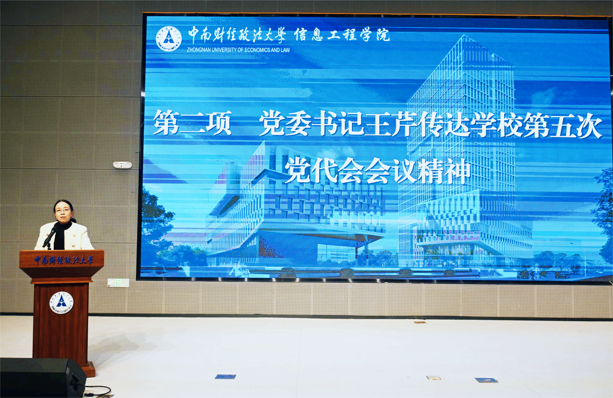王芹传达了学校第五次党代会精神。她强调,学校第五次党代会擘画的“坚持融通特色、矢志世界一流”宏伟蓝图为学院发展指明了方向,大会提出的“财经政法深度融通”发展路径与学院定位高度契合,“数智革新”战略为学院发展注入强劲动力,学院党委要始终坚持以党的政治建设为统领,落实立德树人根本任务,以“功成必定有我”的担当,推动党代会精神落地生根。一是要突出政治建设核心,抓思想铸魂,强党建引领,固基层堡垒,筑牢学院发展根基。二是要坚守立德树人初心,构建数智育人体系,强化数智实践赋能,打造数智师资精英,培育拔尖数智人才。三是要锚定高质量发展靶心,做强主干学科集群,构建交叉创新生态,深化全球协同机制,勇担时代发展使命。