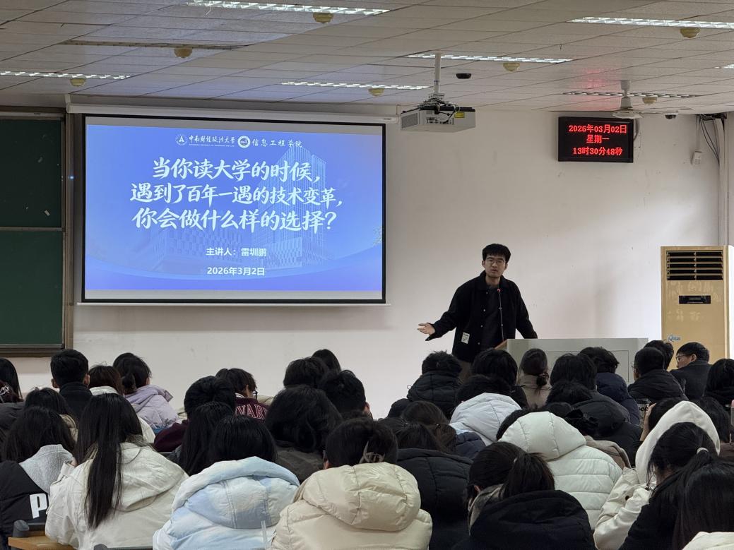 (通讯员 焦馨蕙 学生通讯员 崔甲祥)为引导大一新生明晰成长方向、提升生涯规划与创新创业能力,学院于3月2日特邀猴子说话(武汉)科技有限公司创始人雷圳鹏校友及其创业伙伴朱峰到首义校区为大一新生开展创业分享会,讲解人工智能产业前沿态势。学院党委副书记石龙、2025级辅导员焦馨蕙和李梦梵出席活动,本次分享会共吸引270余名学生到场参与。