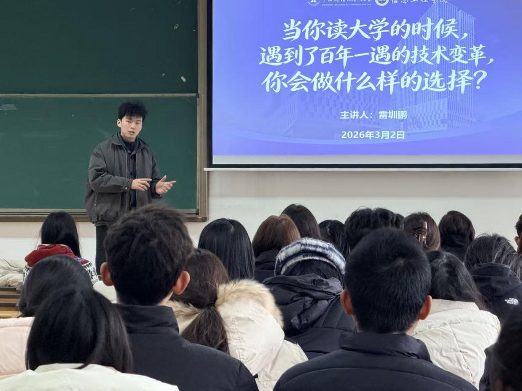 会上,雷圳鹏送上真挚寄语:AI时代早已打破专业边界,大学生不应局限于书本知识、做“只会埋头苦读的书呆子”,要充分利用好信息管理的学科资源。他鼓励大家走出认知囚笼,以热爱为燃料,点燃自驱力,在探索中成长,在挑战中收获。