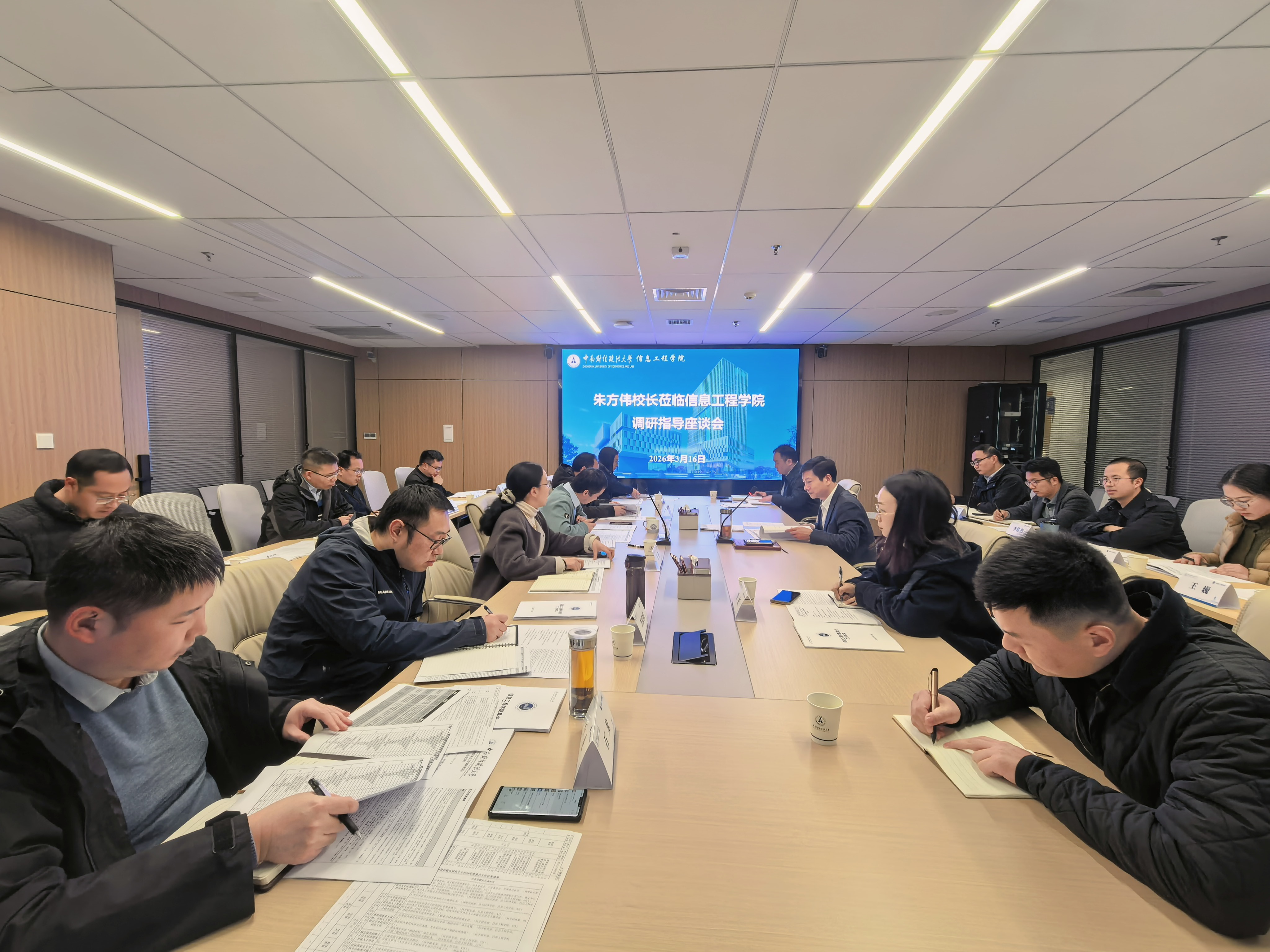 朱方伟对学院发展成效给予充分肯定,并对学院“十五五”规划落地、推进高质量发展提出工作要求:一是明确定位,突出特色,立足学校财经政法融通优势,深耕数智学科与财经、政法领域交叉融合,打造特色发展模式,在交叉领域形成核心竞争力;二是系统谋划,有序推进,以“十五五”规划为牵引,细化年度任务,建立工作台账,明确责任主体,形成“战略-规划-任务-考核”闭环机制,确保各项工作落到实处;三是聚焦重点,精准发力,纵深推进人才培养综合改革,加大高水平师资引育力度,持续深化内部治理体系改革,为学院高质量发展提供坚实支撑和坚强保障。