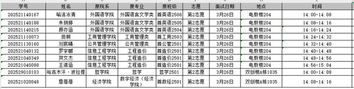 根据《中南财经政法大学本科生调整修读专业(类)管理办法》(中南大本字〔2025〕30号)文件精神、《2026年信息工程学院调整修读专业(类)实施细则》和《关于做好2026年度普通本科学生调整修读专业(类)工作的通知》,经学生申请,学院审核后,现将第二志愿面试安排公示如下。请各位同学提前5-10分钟到指定面试地点候场,注意现场秩序。学院咨询联系电话:027-88385112 联系人:刘老师信息工程学院2026年3月24日