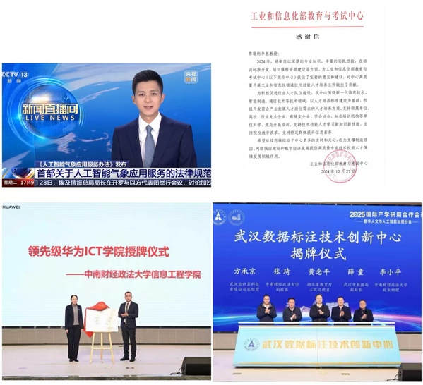 学院每年向各级政府部门提供多项决策咨询服务,产生了良好的社会影响。国内首部促进和规范人工智能细分领域应用的部门规章《人工智能气象应用服务办法》于2025年4月获中国气象局和国家互联网信息办公室联合印发,学院系统性地承担起科技论证、深入调研、专业咨询等一系列任务,提供了技术支撑与保障,推动了《办法》的顺利制定与完善。学院教师于2024年底获工业和信息化部教育与考试中心发送感谢信,感谢其在培训标准开发和课程资源建设方面提供的帮助,为该中心开展工业和信息化领域技术技能人才培养工作做出了贡献。2025年12月,学院通过华为公司认证,获颁最高等级“领先级”华为ICT学院荣誉,并获得武汉市数据局设立“武汉数据标注技术创新中心”。
