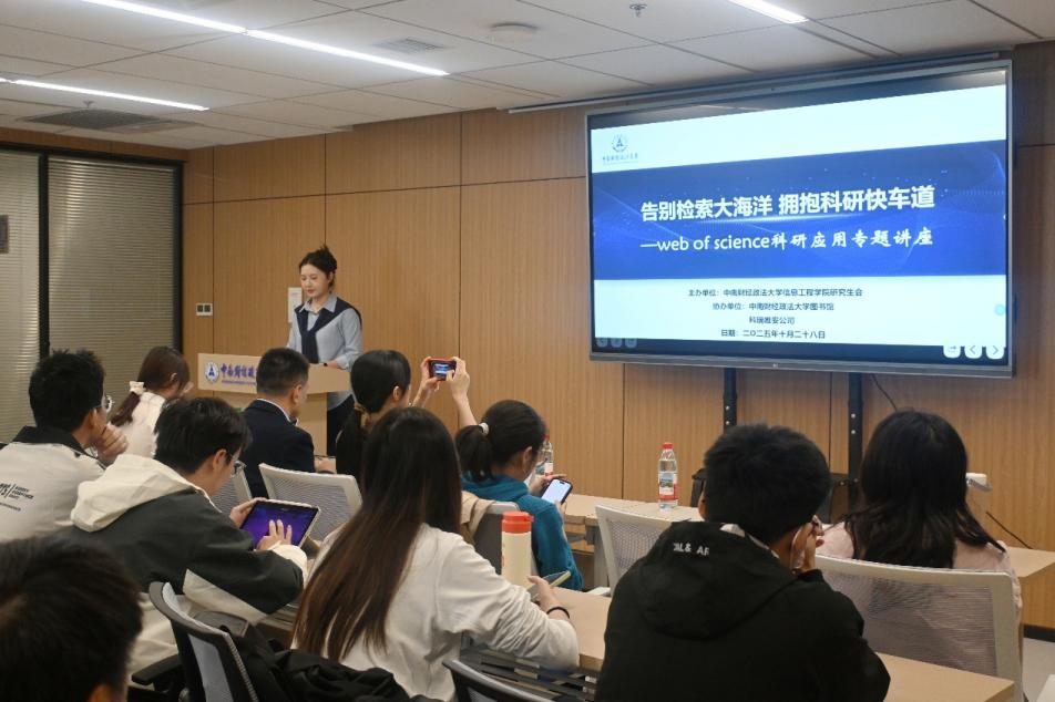 (通讯员 王毅 学生通讯员 胡昕冉)为扎实推进研究生科研能力建设,提升学术资源获取与利用水平,10月28日下午,以“告别检索大海洋 拥抱科研快车道”为主题的Web of Science科研应用专题讲座在双创楼913会议室顺利举办。我校图书馆信息咨询部主任封洁、科睿唯安产品解决方案高级专家马亚鹏担任主讲嘉宾,围绕学术资源体系构建与科研实战技能提升展开深入讲解。
